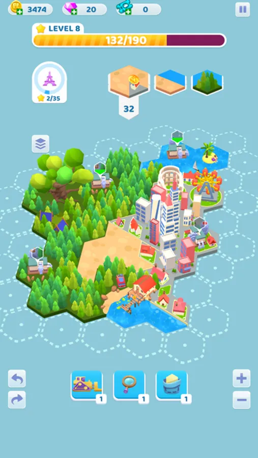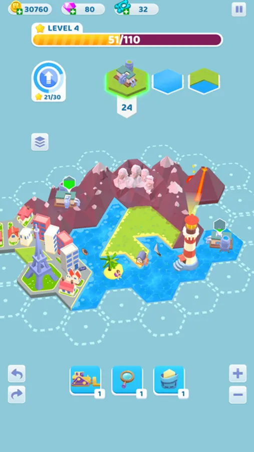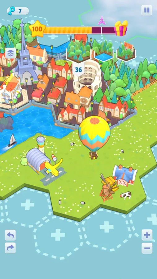 • Each piece you place earns you stars, and the as the number of stars increases, you unlock new world-building features such as factories, farms, oil rigs, monuments, leisure facilities and other infrastructure that add further variety to your ever-growing world.