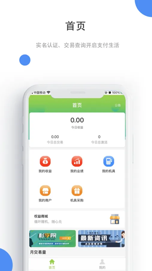 代理商通过该软件可以快速开展展业活动:查看收益、查询机具、查询商户、机具采购等。