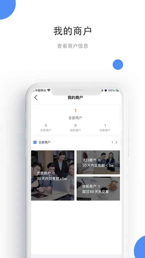 用户可一站式管理名下相关业务,改变了传统代理商业务管理模式,随时随地查看交易情况!