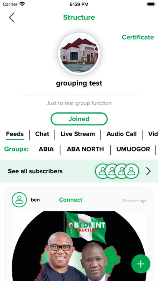STRUCTURE MEDIA , APP “OBEDIENT STRUCTURE” is a digital Networking community, for support groups, interest groups, campaign groups, political support groups, political parties, institutional organizations, religious organizations, business organization and any organization that requires a complete/partial nation wide networking, connection, coverage and effective grassroot presence. hosted structure/group on this platform are provided with a digital space which offers them independence with a grouping functionality that gives them the ability to unify and bring together national and diaspora members of these structure/ groups and general voters/members right up to the grassroots level (polling units) using the adopted current INEC electoral structure levels, which are categorized as 36 state, plus FCT Abuja, 774 local government, 8,813 wards and 176,846 polling Units. These groups are further provided with an integrated digital modern management, communication and organization tools such as group chat, one and one chat, RTC Voice and video calling, Livestreaming, content post and sharing, contribution solutions, structure management solutions, accounting solutions, payment processing solutions, Announcement and publication feeds tools, structure/group management and central command integrated system that enables the appointment of administrators for the sub-groups and direct, effective ,secure connections between the administrators and the structure/ group members in all group levels from the state, local government, ward, polling units, diaspora, candidates and entire group management and its affiliations.
