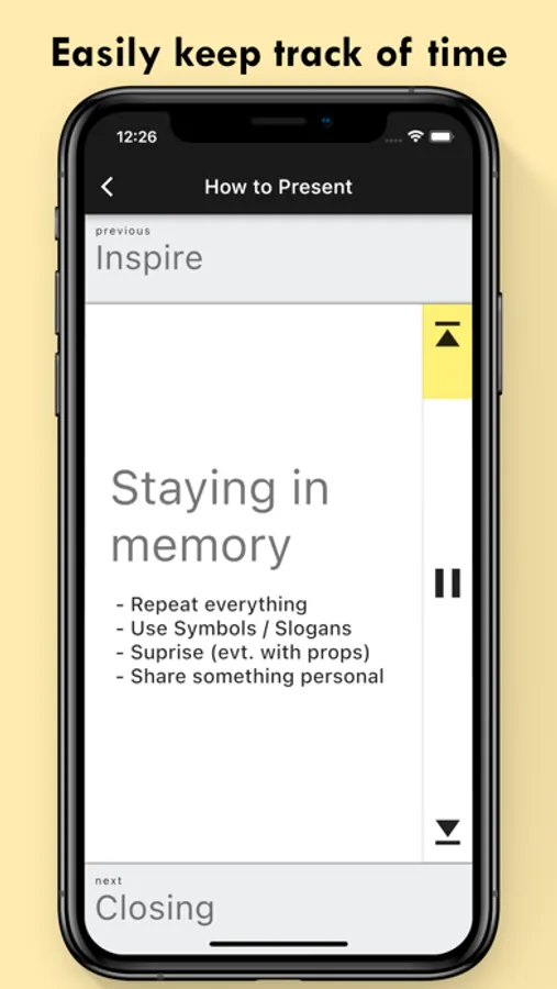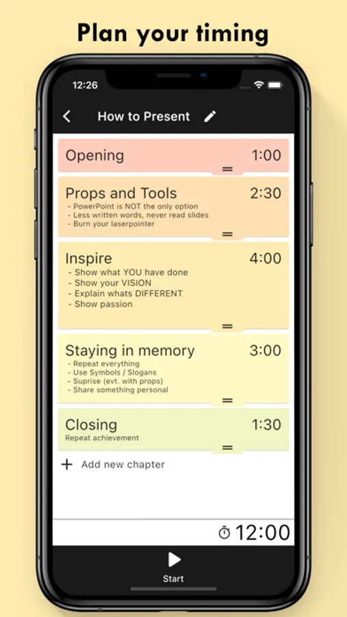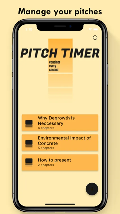 With Pitch Timer, you can easily create and customize your pitch by adding chapters and setting their associated time and description.