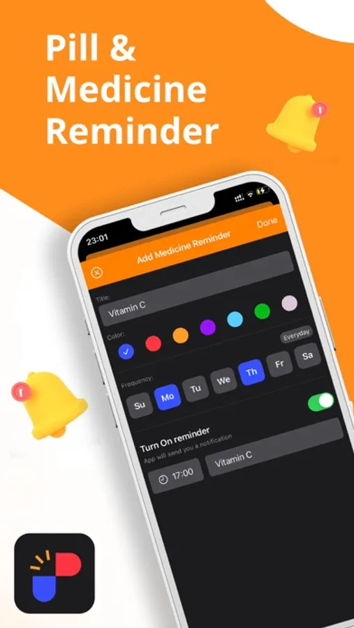 - Customize your pills with colors, photo and notifications sounds;