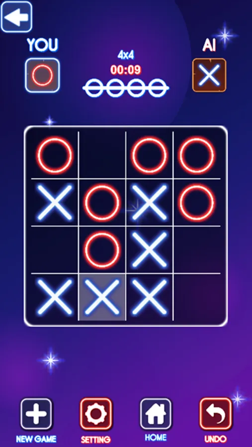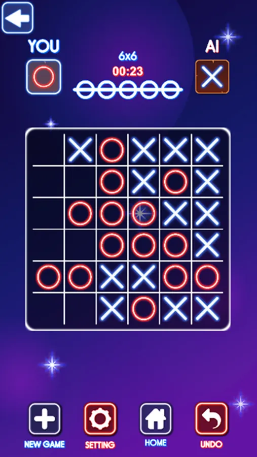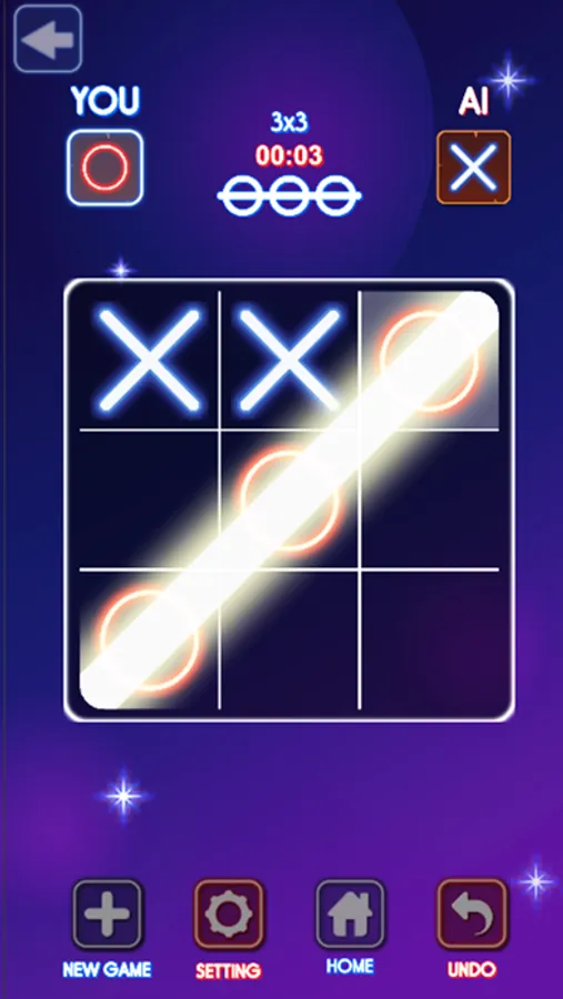 In our new tic tac toe game we have a smart AI system for playing with computer mode. In vs with computer we have three difficulty modes which will not allow to win this 5x5 tic tac toe game easily. You will enjoy the glow effect of the xo xo and cool animation when you complete the level. In this free tic tac toe puzzle you can play offline with computer or you can play with your friends in 2 player mode on same device. This neon tic tac toe provides lots of customization options theme color, AI difficulty modes and board sizes and more. The 5x5 Tic Tac Toe is a best way to use your free time whether you're spending time with friends or alone this game will make your mind sharp and best fit for your time pass. Start download and play free Tic Tac Toe game and let the fun begins!