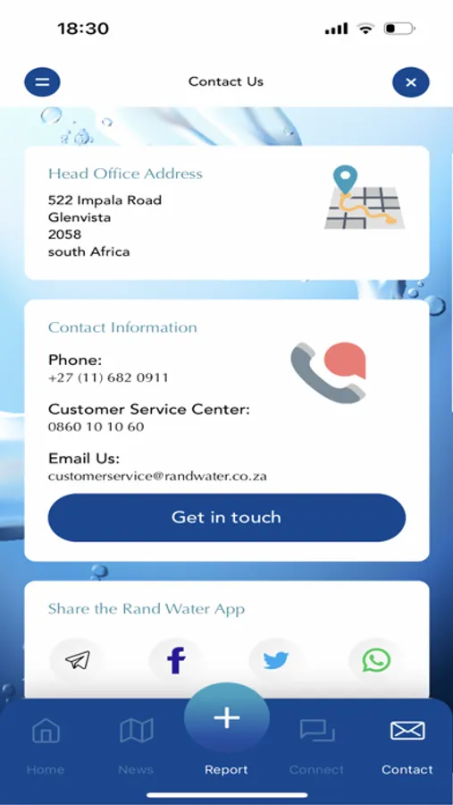 "The Rand Water Mobile App was developed to allow customer and the public to assist in saving water and reporting damages to water infrastructure.
