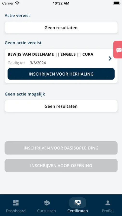 Altijd en overal inzicht in jouw leerreis, van A tot Z. Met de CURA BHV app krijg je op tijd een notificatie wanneer je certificaat bijna verloopt. In de app kun je je dan gemakkelijk inschrijven voor de herhalingscursus. Op het moment dat je cursus van start gaat, kun je ook inzien wat je vooruitgang is, en ga je gemakkelijk door naar de Digital Classroom. Cursus gehaald? Top! Je certificaat is meteen te vinden (en downloaden) in de app. Net zo handig.