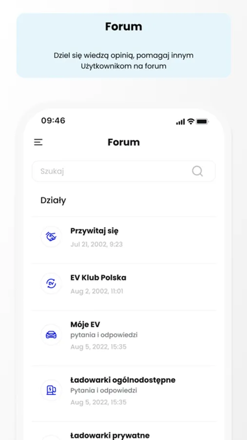 Naszym celem jest pomoc i wzajemne wspieranie się użytkowników samochodów elektrycznych. W tym celu udostępniamy aplikację i jej podstawowe funkcjonalności: