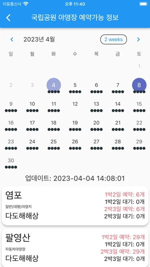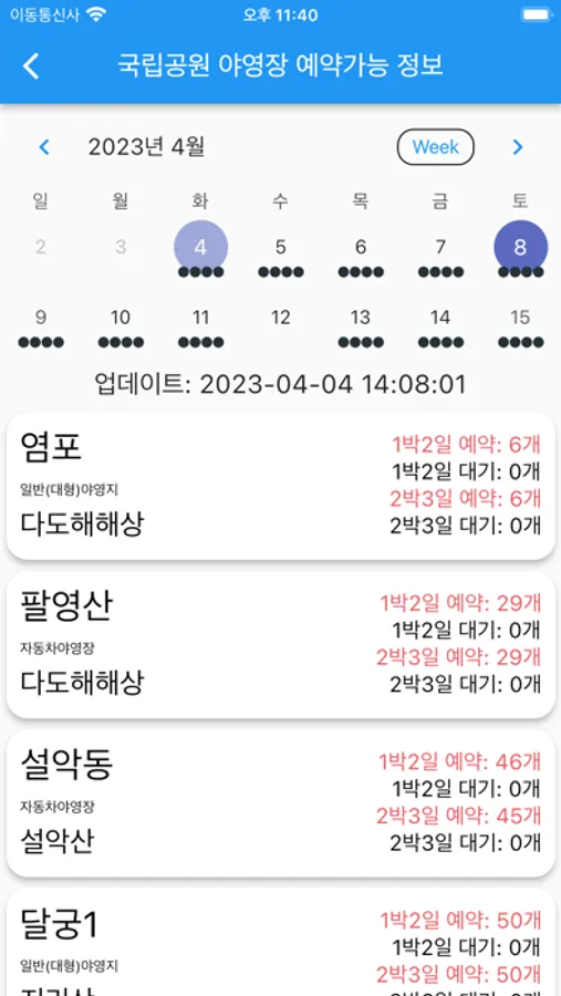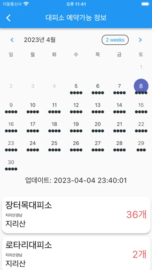 2. 실시간 빈자리 정보 확인: 선택한 야영장 및 대피소의 현재 빈자리 상황을 실시간으로 확인할 수 있습니다.