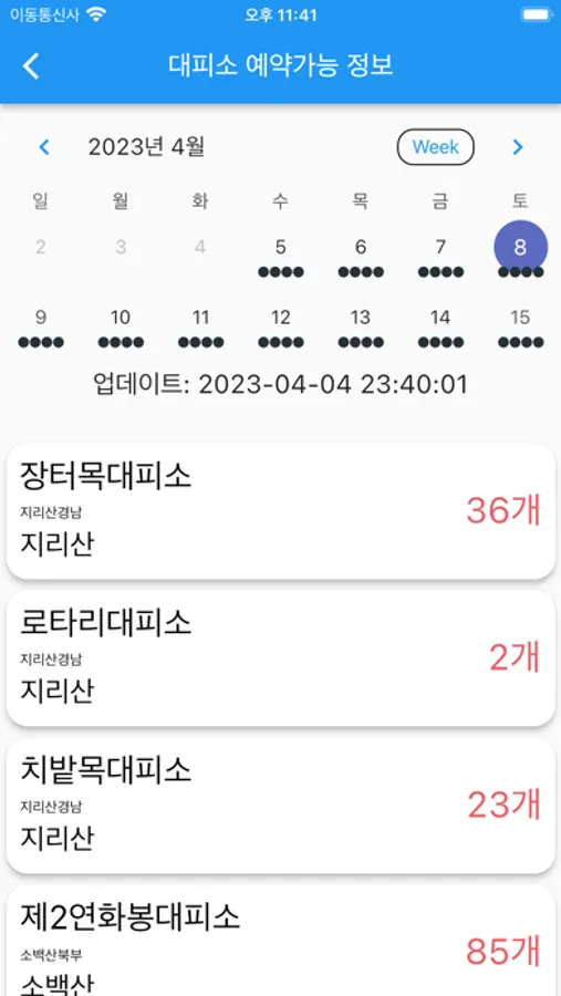 앱을통하여 해당일의 모든 야영장 및 대피소 빈자리 정보를 바로 확인 할 수 있습니다.