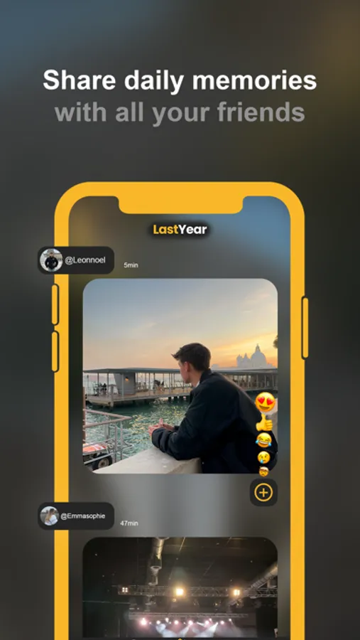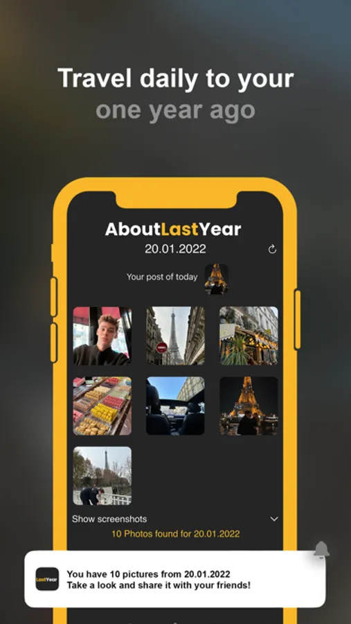 LastYear is the first platform that allows you to share all your moments from "One Year Ago Today" in the form of photos, once a day, with your friends and the whole world. Let your memories come alive again!