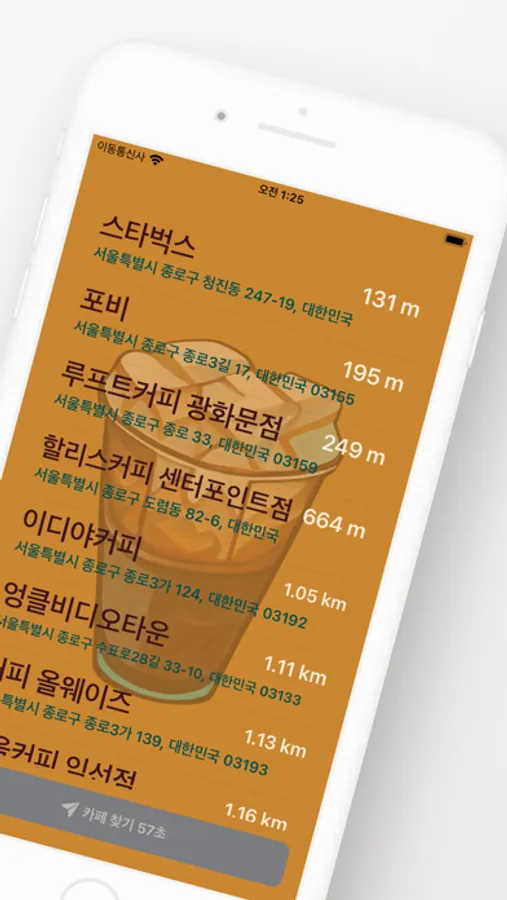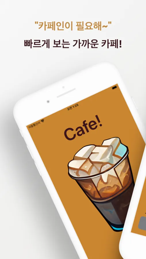 * 카페 탐색 버튼을 누르면 자신의 근처에 있는 카페들을 가까운 순으로 보여줍니다.