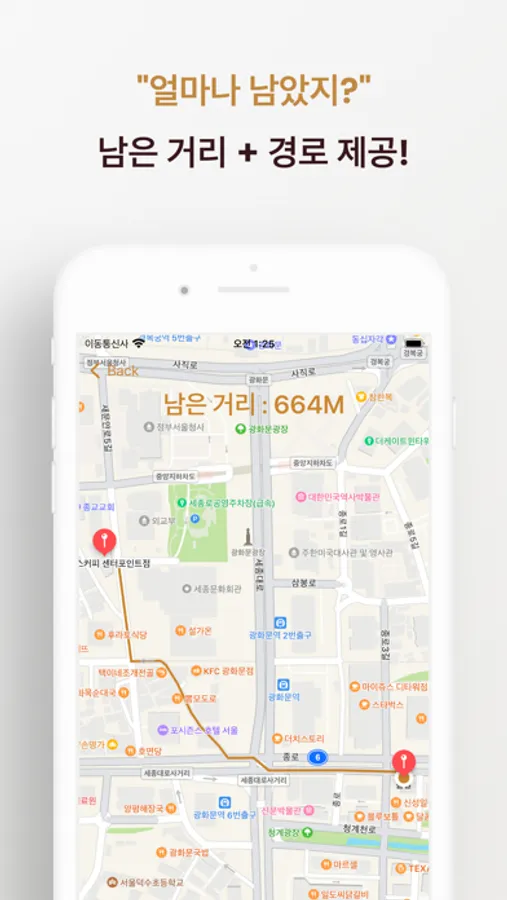* 지도에 표시된 경로와 거리는 사용자가 이동함에 따라 업데이트 됩니다.