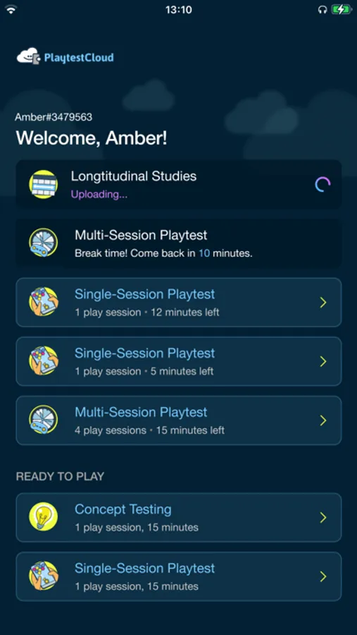Login into your PlaytestCloud account and browse through all available playtests, surveys and other research, joining and tracking your time on each one easily.