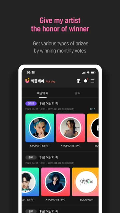 Give your favorite artist the honor of winning 1st prize. [Monthly PICK] Monthly popularity votes of K-pop artists and actors, etc. [1 PICK] Votes for various topics.
