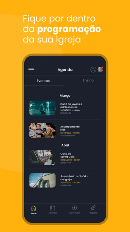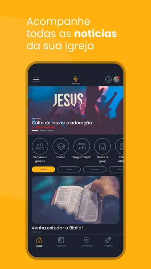 Recursos disponíveis no Aplicativo: Notícias, Agenda da igreja, Eventos, Conteúdos, Projetos, Transmissão ao Vivo e Módulo Ensino.