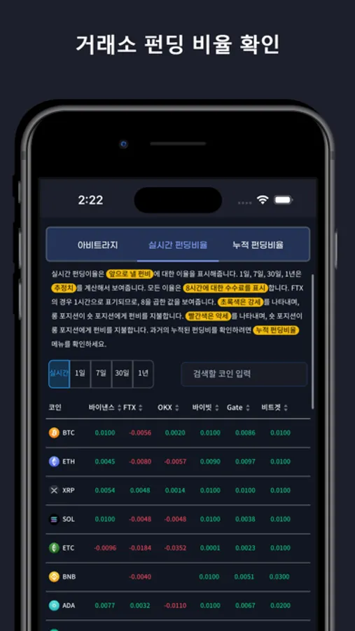 실시간 펀딩비, 누적 펀딩비, 롱숏비율, 청산비율 등을 한 눈에 살펴보세요.
