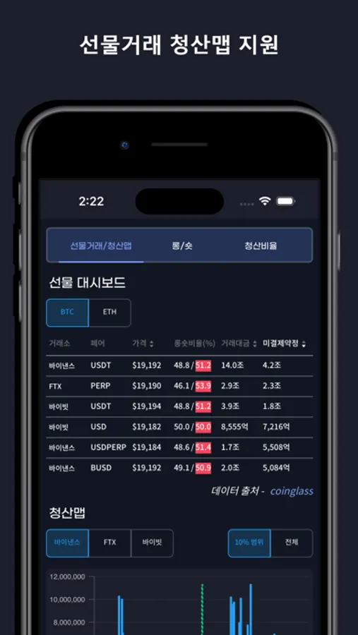 선물 거래를 위한 청산맵, 차트 등을 제공합니다.