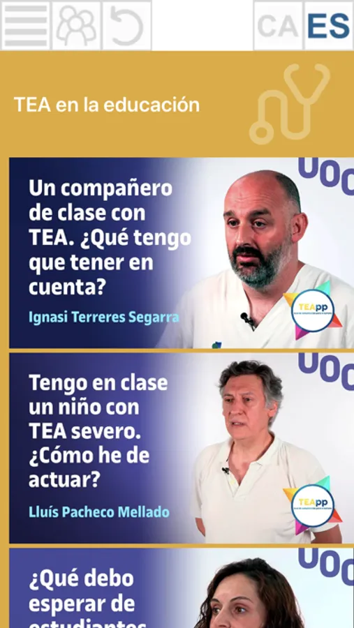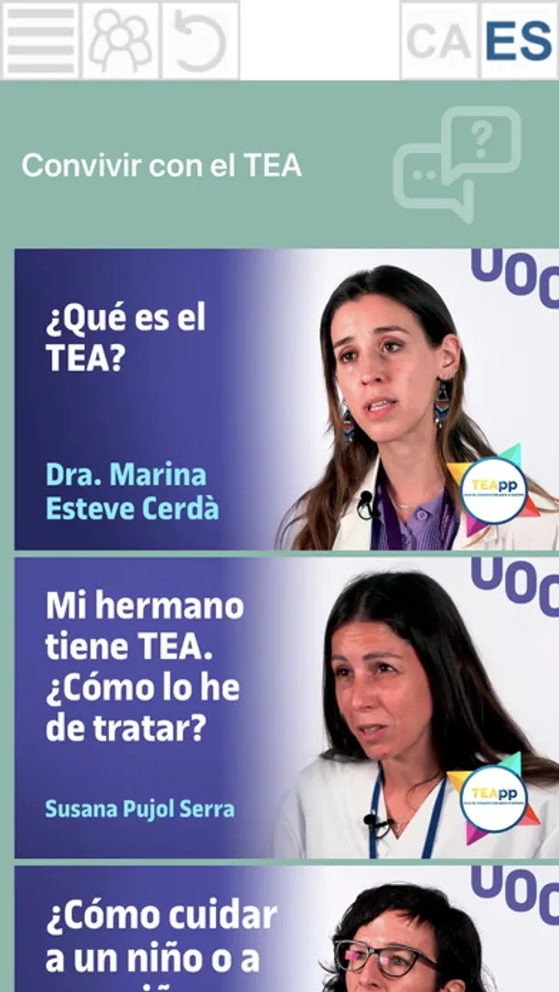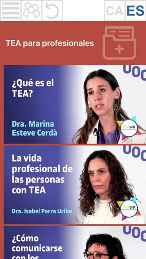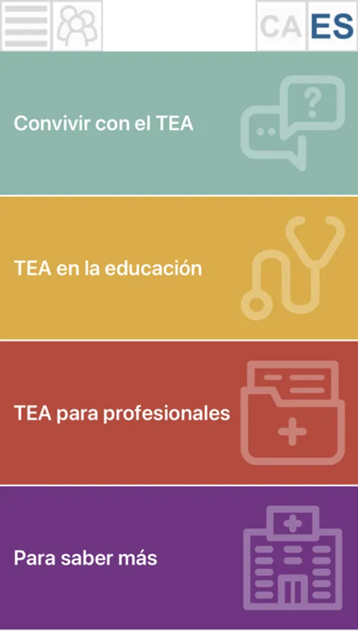 TEAapp es una aplicación que ayuda a la persona con TEA (y/o familiar) a gestionar situaciones comunicativas con los profesionales de la salud. El principal objetivo es superar la problemática comunicativa en determinadas situaciones del proceso de diagnóstico de la enfermedad. Desde fases iniciales hasta situaciones propias del desarrollo del tratamiento tal como la entrega de un informe médico o la realización de una prueba médica.