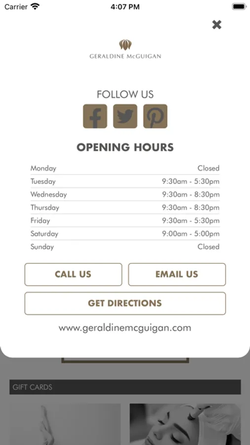 The Geraldine McGuigan Clinic booking app allows clients to log on and make bookings online under their own profile 24/7. Clients can track loyalty points as well as look at historic and future bookings and get directions for their favourite beauty salon.