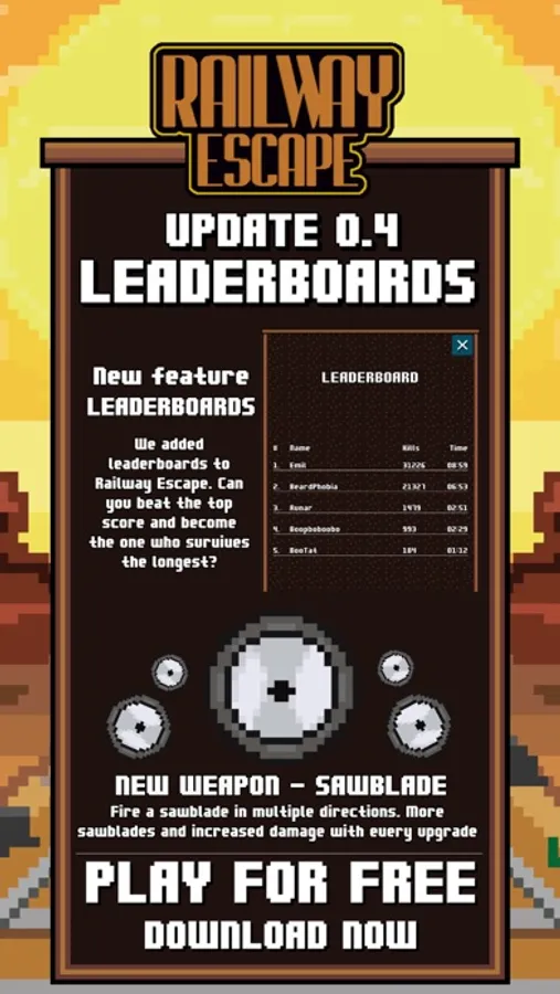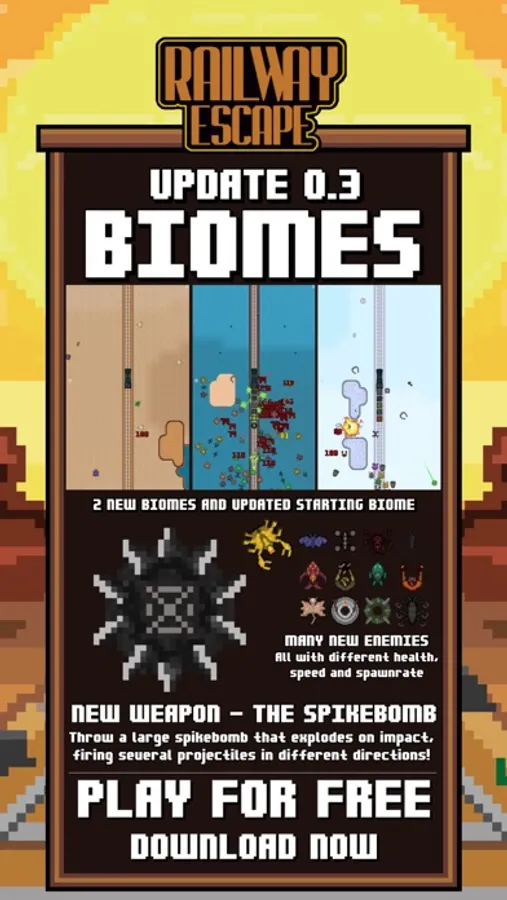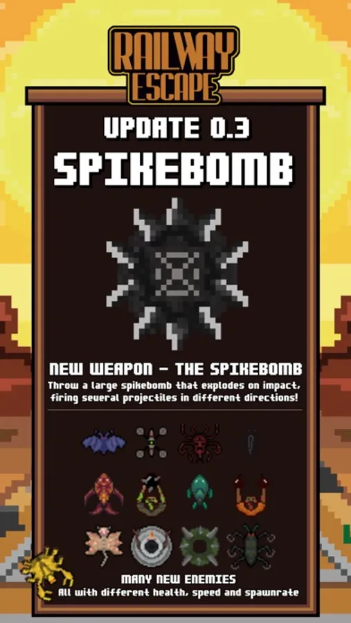 Battle hundreds of monsters and survive as long as you can in Railway Escape. Protect your train at all costs and upgrade your arsenal of weapons to become more powerful in this Bullet Hell game. It is up to you to clear a path to safety for you and the passengers on the last train to freedom on earth. Exciting gameplay, hordes of monsters, many weapon combinations and thrilling music will make Railway Escape your goto game when you have a few minutes to spare.