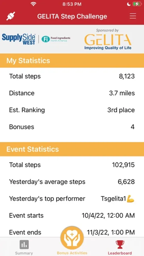 App supporting the GELITA Step Challenge at the SupplySide West & Food ingredients North America, sponsored by Gelita. The GELITA Step Challenge will be held during November 1-3, 2022, in Las Vegas NV. The Challenge encourages event attendees to engage in healthy activities and some friendly competition.