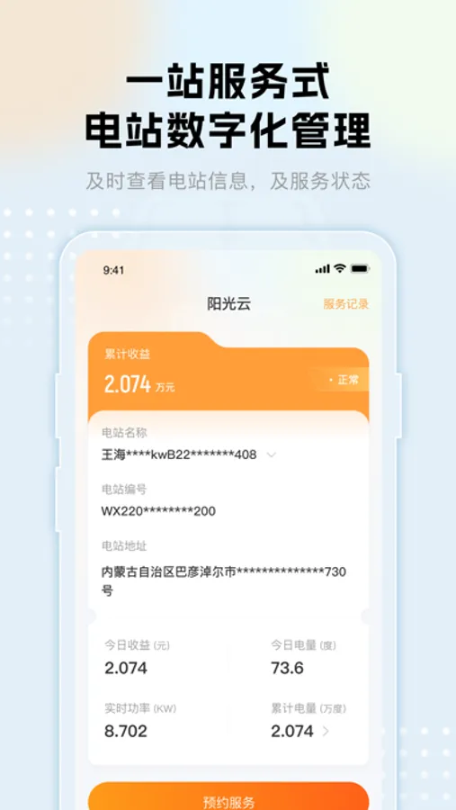 阳光云平台app是阳光家庭光伏智能云平台专门针对家庭光伏用户推出的一款移动端解决方案,用户通过应用可以方便、快捷的进行项目、订单、用户的管理;通过应用亦可管理自己的电站信息,如发电、收益、监测、工单等;