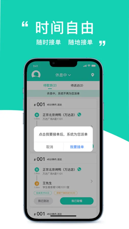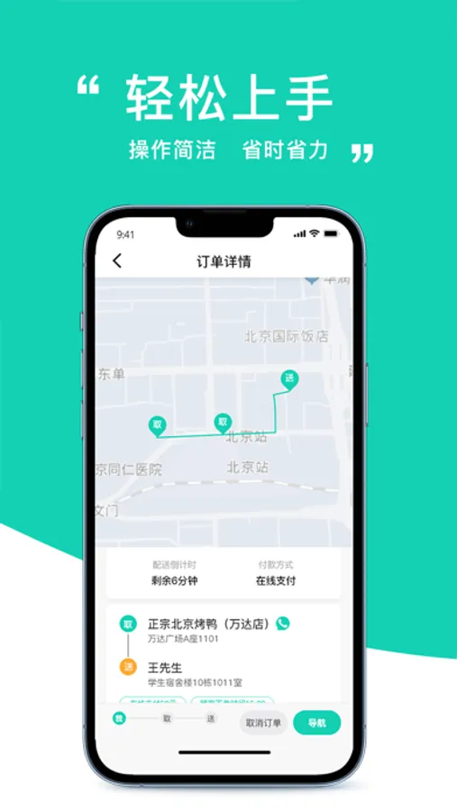 操作简单 - 只需接单、到店、取餐、送达四步点击即可完成订单;