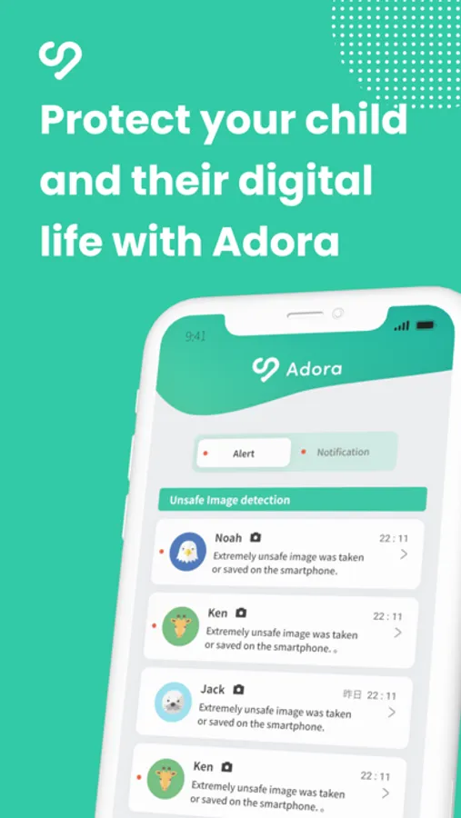 - When a potentially obscene image is taken on your child's phone, Adora’s AI detects it and sends the notification to the parent's phone (and the child will be notified to delete the image).