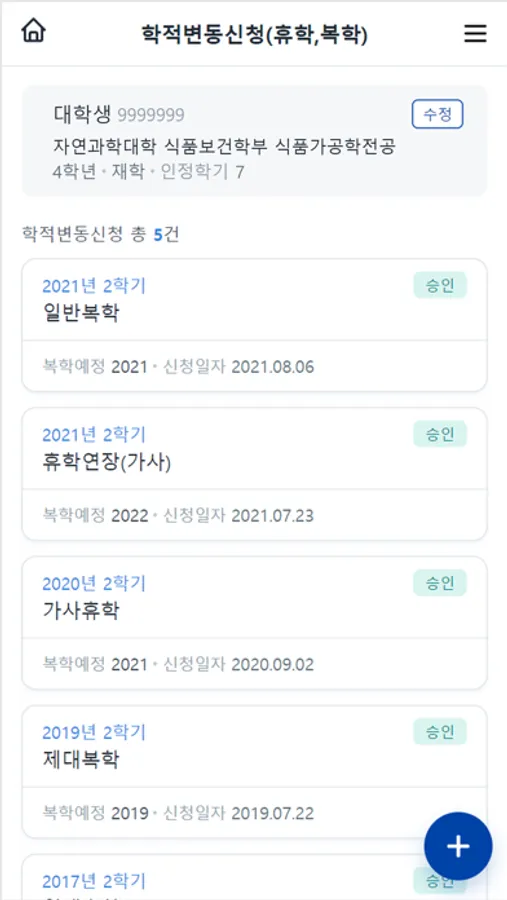 학사메뉴: 학적및학사자료 조회, 학사관련신청 등