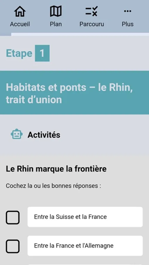 A la fin de chaque station, l'utilisateur reçoit une pièce d’un puzzle de 10 pièces qui doivent être assemblées à la fin du parcours. Ensuite, les solutions (vrai/faux) des activités apparaissent.