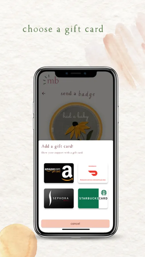 Our newest feature allows users to attach gift cards to badges: send a digital Starbucks gift card with an “Up All Night” badge or a digital Door Dash gift card with a "Had a Baby" badge. Mom Badge includes Starbucks, Door Dash, Amazon, Target, and Sephora digital gift cards.