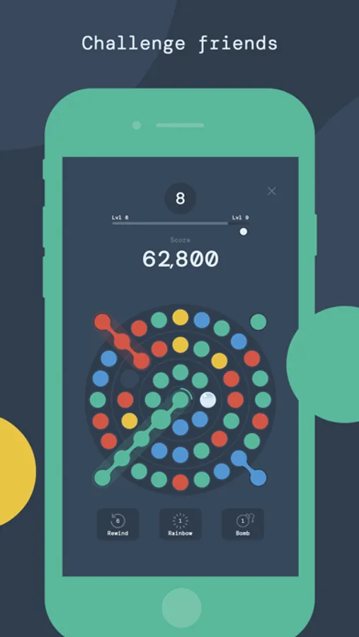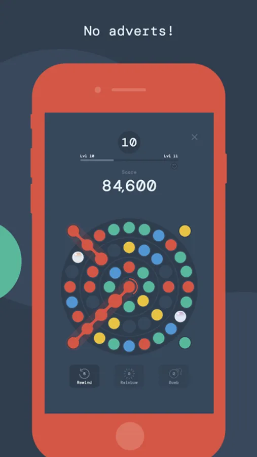 Earn perks to improve your chances, including Rewind giving you a second shot, Rainbow to chain with any color, and Bombs to clear out the board.