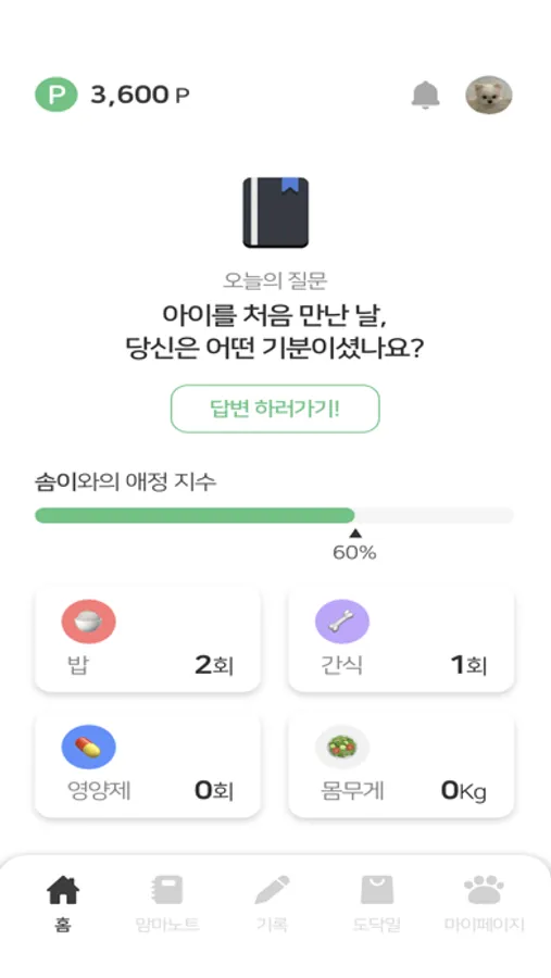매일 새로운 질문을 통해서 반려동물 육아일기를 작성할 수 있으며