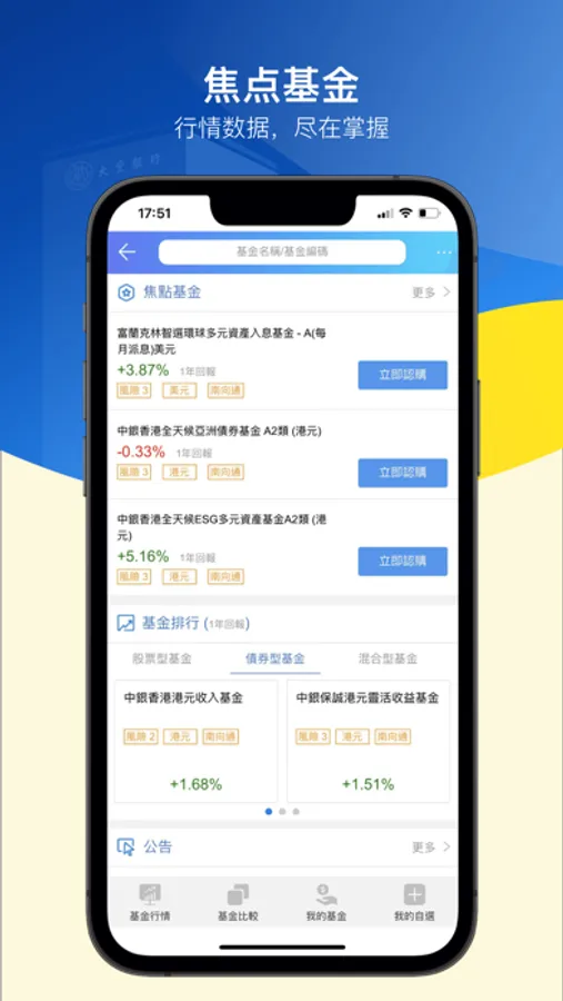 根据市况及个人风险取向、财务状况、投资目标及经验,选择适合您的本地或海外市场基金产品,助您实现财富增值。