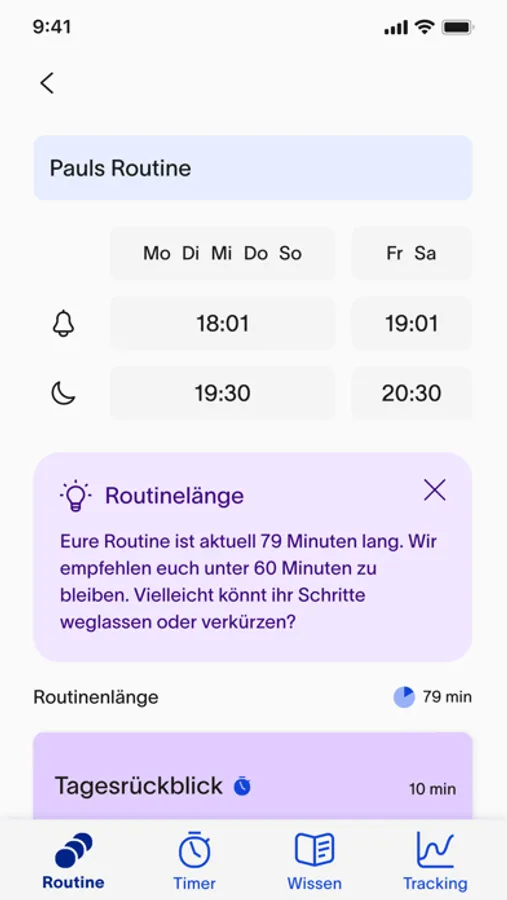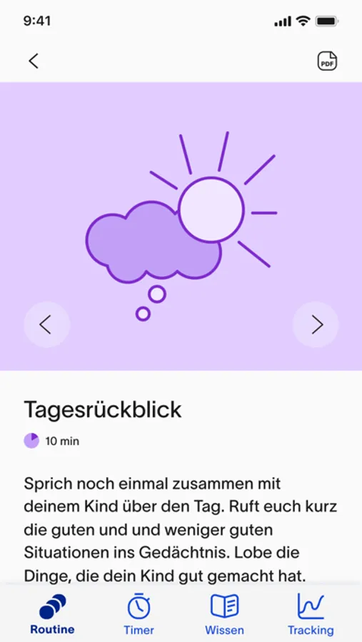 Du wirst Schritt für Schritt durch das Programm geleitet und bei der Umsetzung der Routine mit deinem Kind aktiv unterstützt. Dazu gibt es auch eine Routinetafel, die es ermöglicht, dass dein Kind die Routineschritte interaktiv und ggf. selbstständig erledigen kann.