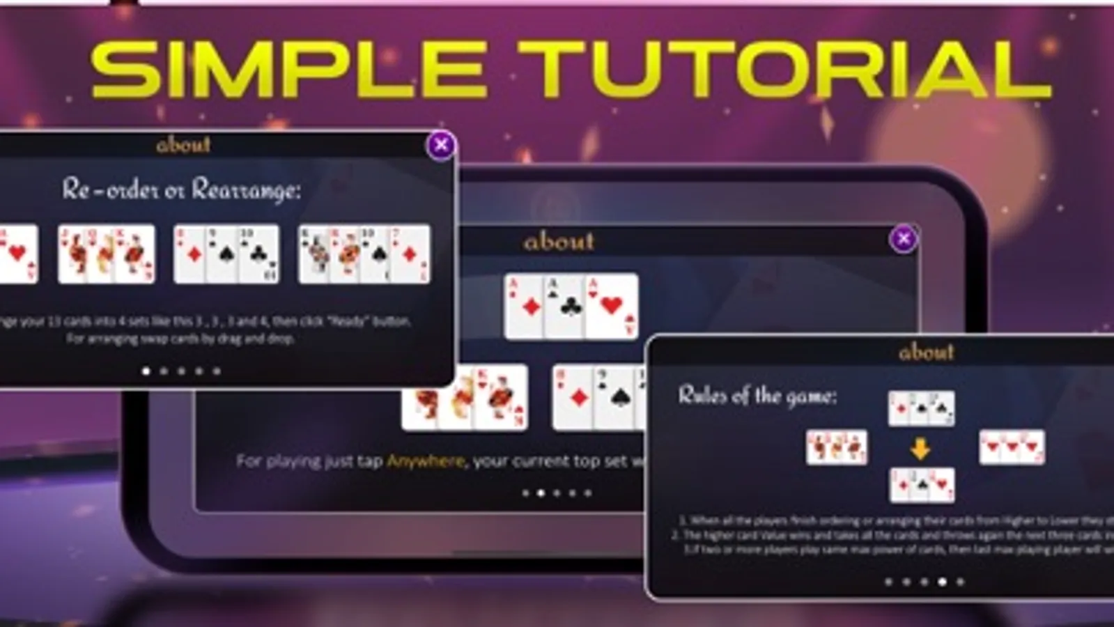 After getting dealt all cards to players, all start sorting their 13 cards into four sets like 3, 3, 3, and 4. After that, all players get ready to show their cards. A player from the dealer's right side starts showing his first card set to the rest. Card groups must be arranged in higher to lower value order.