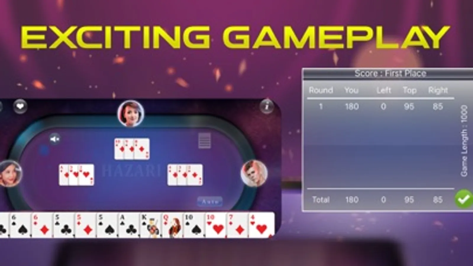 Hazari is one of the classic card games like Call bridge, Call Break & Twenty Nine in Bangladesh. It is also popular in India, Nepal, Sri Lanka & so on. This game offers you a great offline experience. It is a 13-card brag game where players arrange their 13 cards into 4 groups or sets. The game is played by four players, using a standard 52-card deck. The game ends if a player reaches 1000 points. The final winner is decided who can collect 1000 points at first after many games.