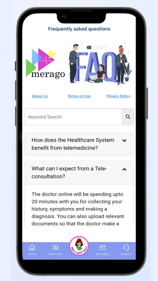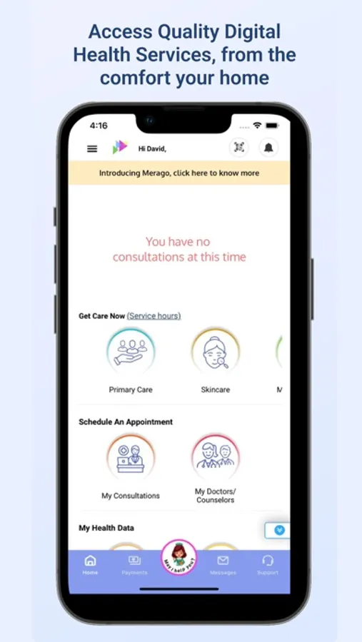 Request an on-demand consultation: Login the Merago app and select either primary care or a specialty care center you need. Pay the required fee or any co-pay if you have a supported insurance.