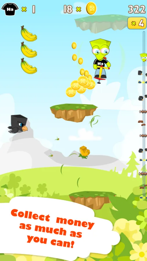 - Fight the crows, and hit them on their head, so that they cannot destroy your pieces of land to jump on.