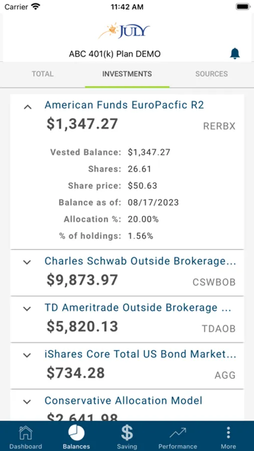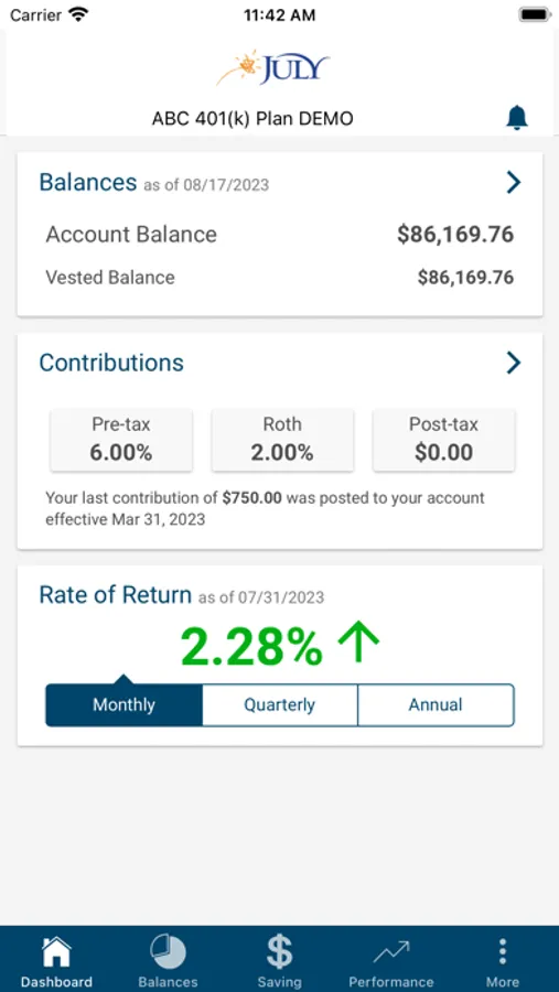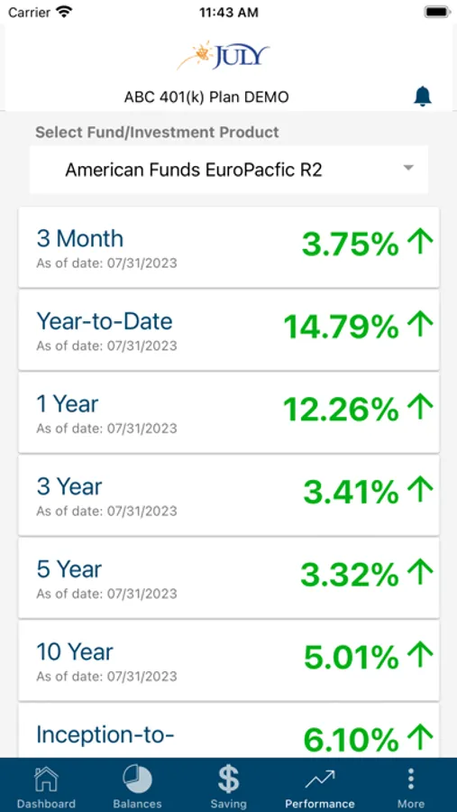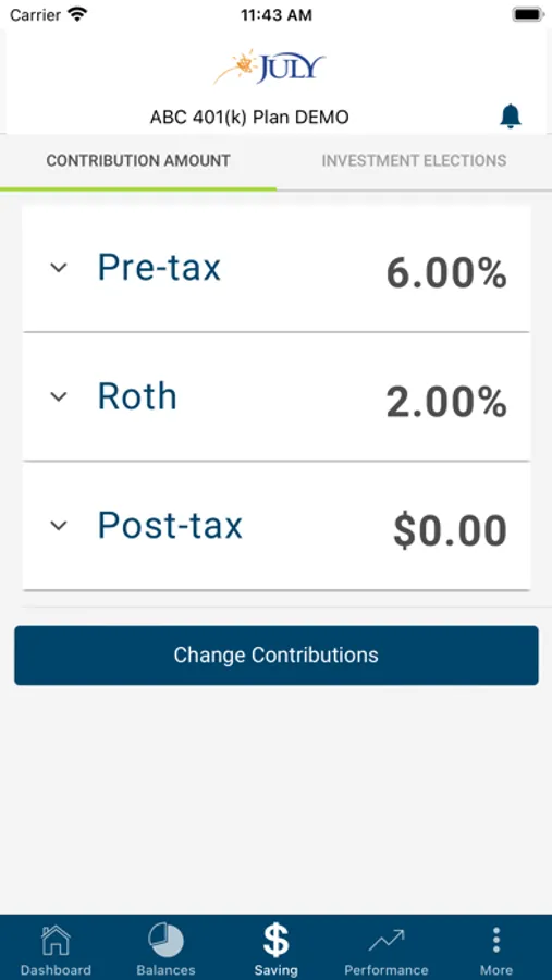 The JULY Retirement app provides you with on-demand access from your mobile device to your retirement account with JULY. With this app, you can view your account balance, review fund performance, view/update your contribution rate, and modify your account password.