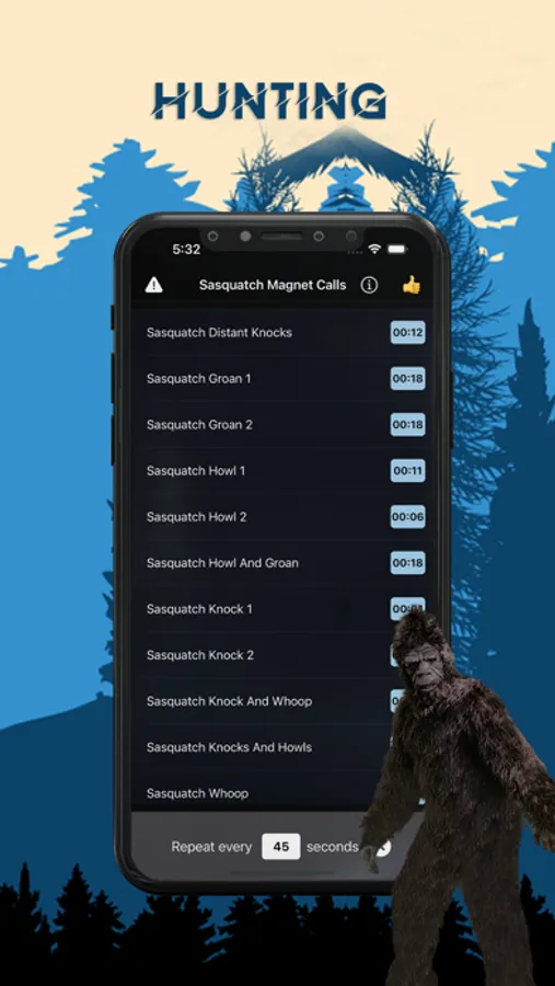 You can play the sounds individually and set them to repeat after the amount of seconds that you desire. Or you can manually tap different sounds create a deadly combination of calls that will work perfectly for the sasquatch you are searching for.