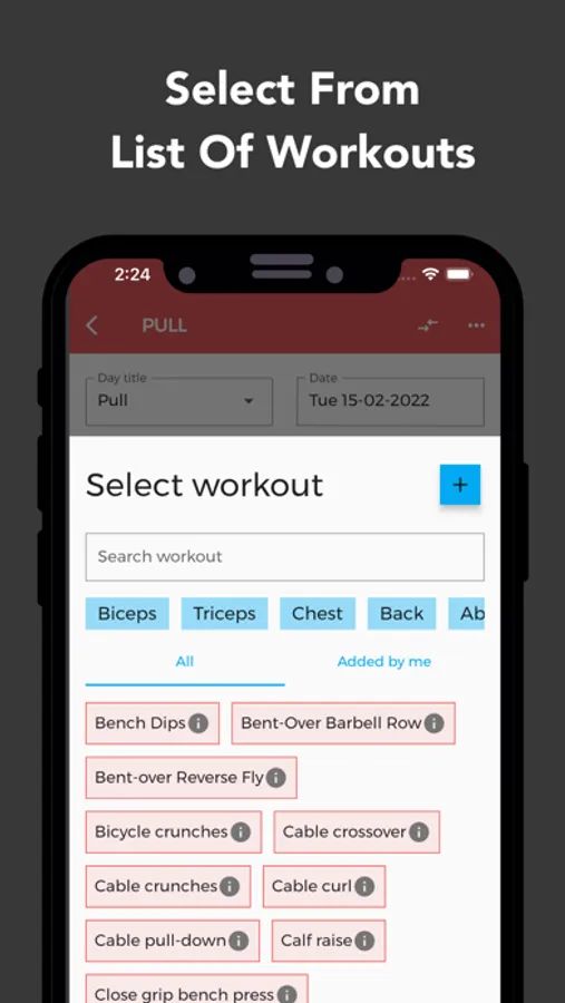 * List of most popular workouts - Easily select from the list of popular workouts. Search by the name of workout or even muscle group. Get information about any workout by clicking info button.