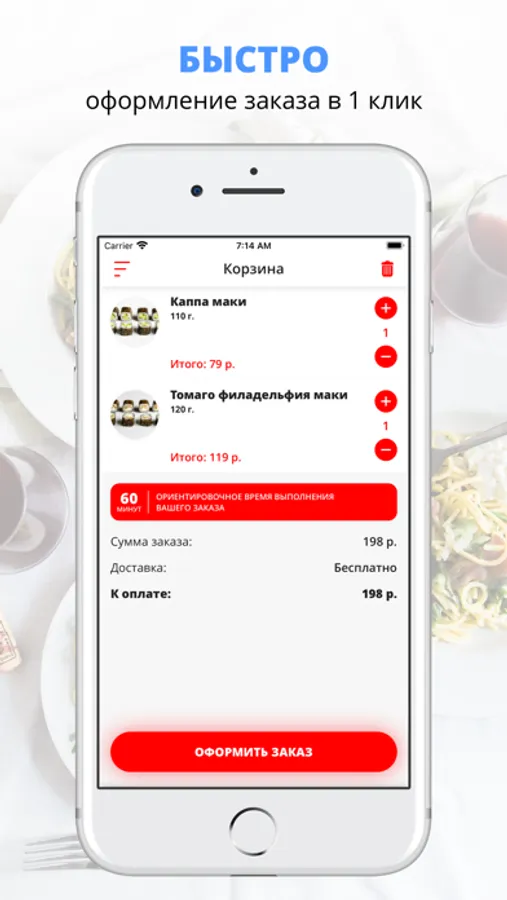 Скачивайте наше приложение, оформляйте заказ и наслаждайтесь любимой едой, где бы Вы ни были! Приятного аппетита!