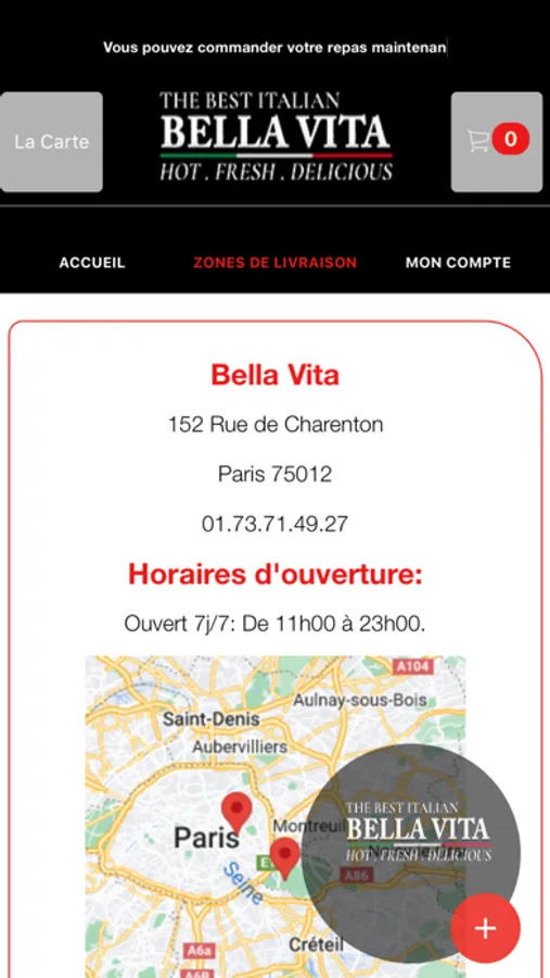 L'application Bella Vita vous permet de commander en ligne ou par téléphone via votre application. Vous pouvez consulter notre carte et choisir vos produits.