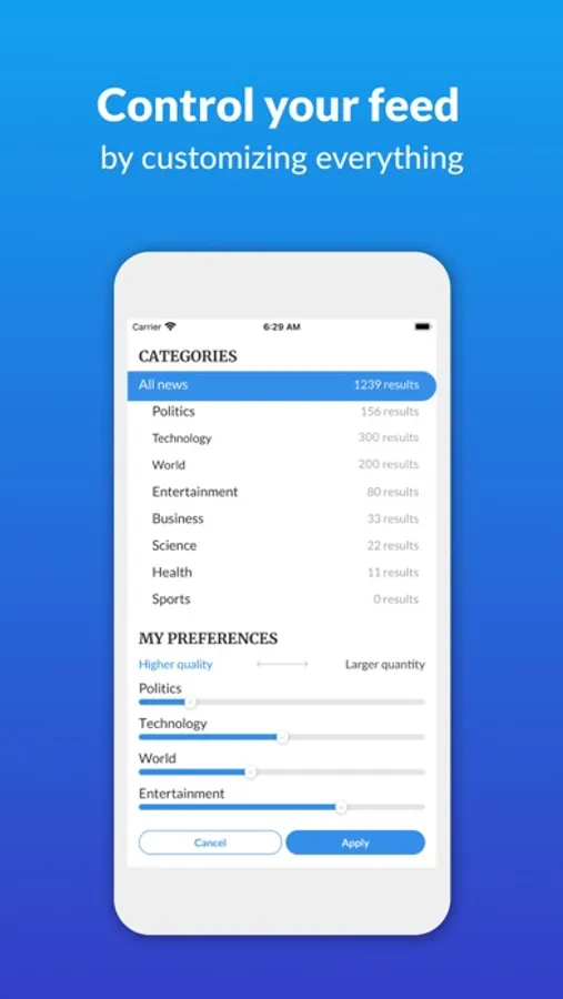 You have complete control over sources, categories and the amount of articles in each category. You can enable and disable publications as you see fit. You can see how we customized the feed to your preferences, and manually adjust every single thing we did. There are no black boxes - you are in control.