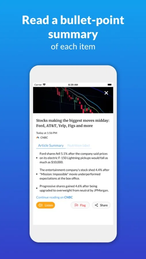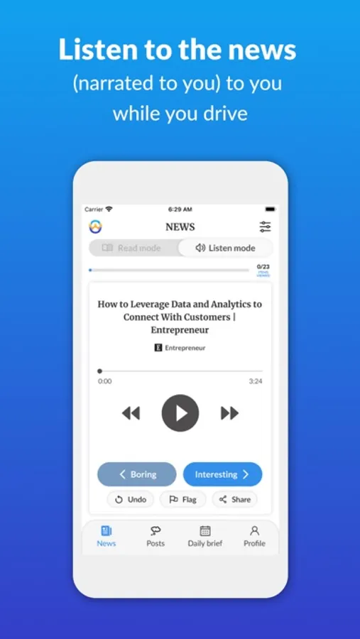 If you like the topic of an article, swipe right (and you’ll see more articles on this topic over time). If you find the topic boring, swipe left (and you’ll see less). If you want to listen rather than read, click a button (or say “listen”) and we’ll play the summary for you. If you want to comment or share, it’s one button-click (or voice command) away.