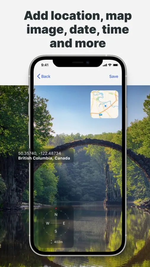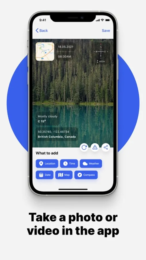 Step 3; Add your location, map image, coordinates, date, time, weather, compass