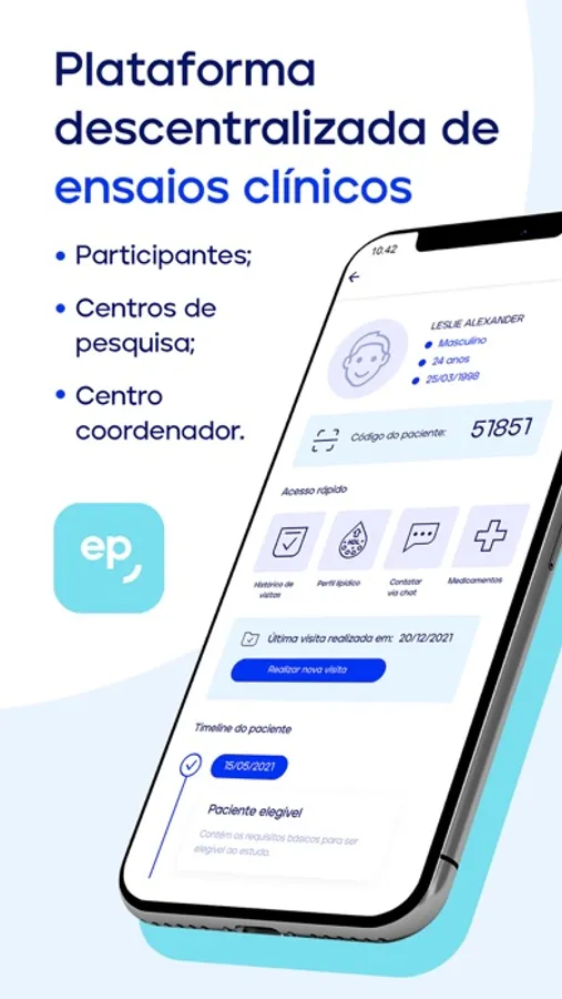 A plataforma descentralizada de ensaios clínicos epScience permite a integração completa entre participantes, centros de pesquisa e centro coordenador. Inclui recursos como formulário de elegibilidade, consentimento eletrônico, controle de medicamentos, exames Point-of-Care e outros recursos para facilitar a condução de ensaios clínicos descentralizados
