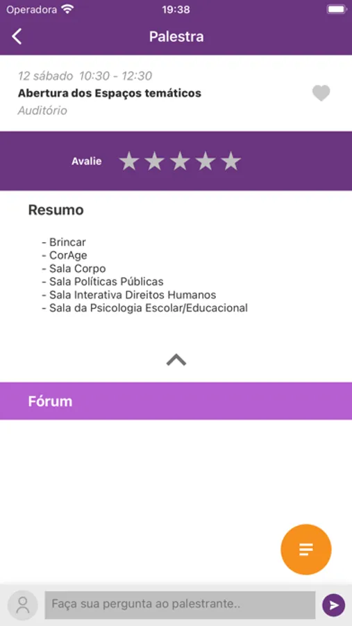 Ao final do evento, também vamos querer a sua opinião, que poderá ser dada respondendo a pesquisa através do próprio aplicativo.