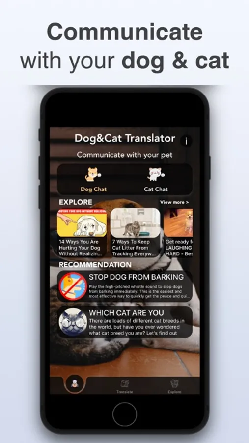 Dog & Cat Translator will help you communicate with your pet by their sounds. This application will help you to play with your pet and get closer to them.