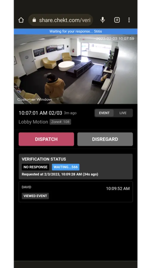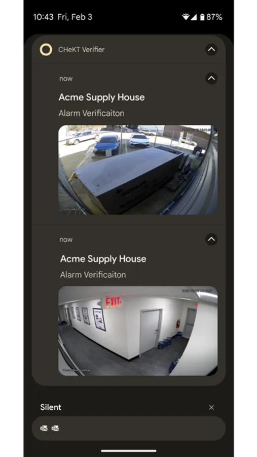 Security monitoring and the accurate response to an alarm is critical to ensuring the effectiveness of your security system. The CHeKT Visual Security system includes a video verification process for a 24-hour video command center to engage you in the decision-making process. Using SMS services or this Verifier app your alarm monitoring center can provide you with instant visual awareness of your property, allowing you to immediately request an emergency dispatch or to disregard the alarm.